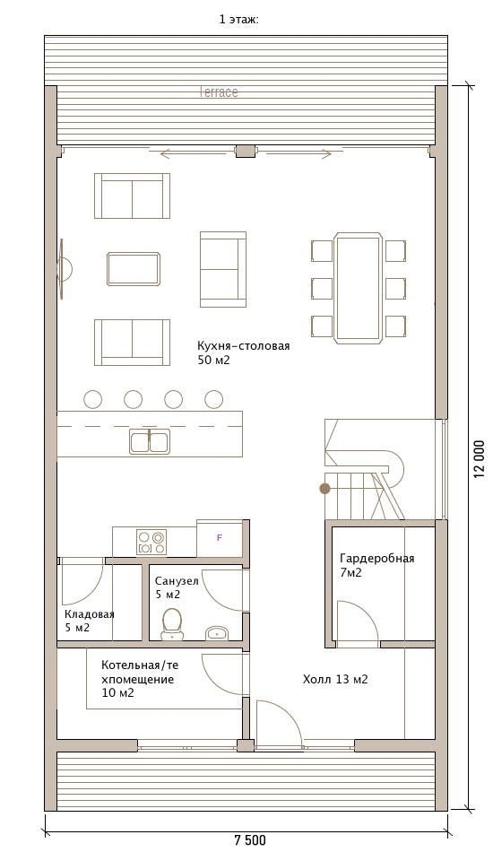 Полноценный дом в современном стиле амбар для постоянного проживания. Визитная карточка этого дома – стеклянный витраж, сквозь который будут освещаться гостиная в первом этаже, которая соединена с кухней-столовой, и одна из спален во втором. Наличие 4-х спален позволит разместить большое количество гостей. Просторная терраса – 42 м2 – для проведения шумных летних вечеринок или уютных ужинов.